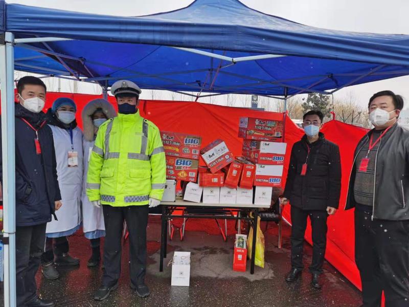 病毒无情,金源有爱,近日天气寒冷,古天乐太阳集团城副矿长刘金伟带队,为奋战在微山疫情防控一线的卡点执勤人员送上方便面、火腿肠、牛奶等物品,向不畏寒风、每天坚守在一线的人民卫士表示慰问。