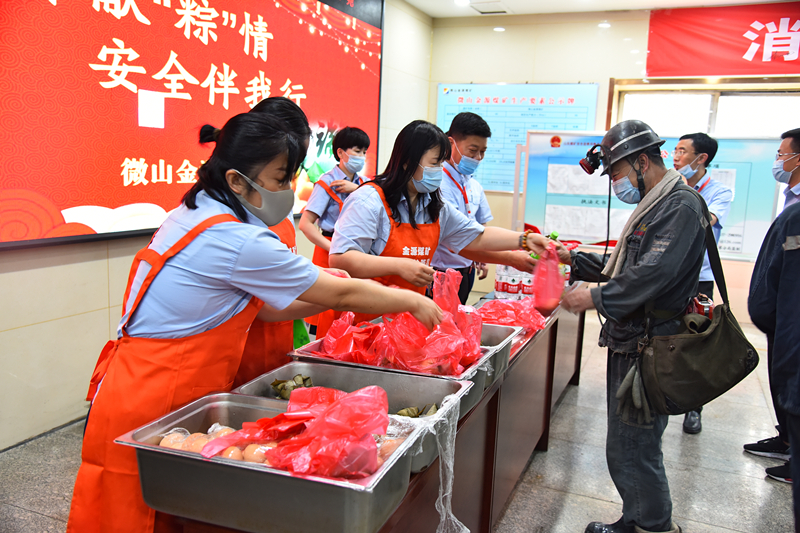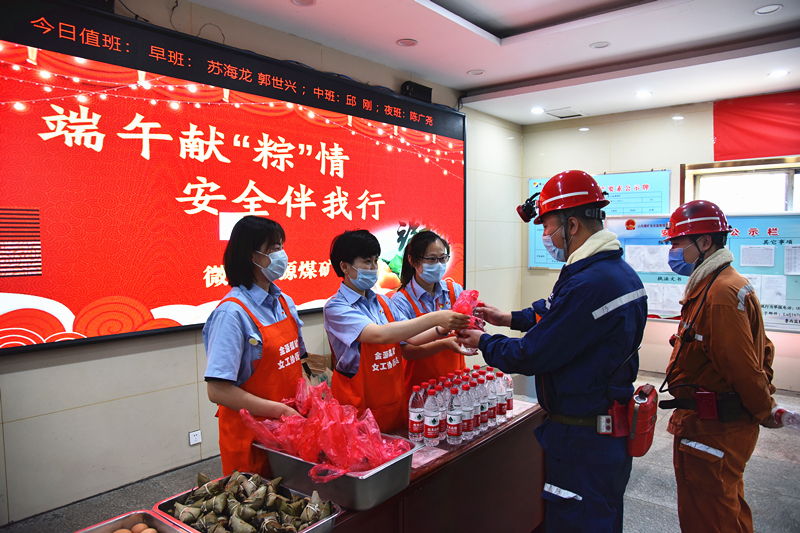 在井口等候室,一大早,女工协管员们将热乎乎的粽子、香喷喷的鸡蛋和凉爽的矿泉水、饮料送到即将下井的一线职工手中,并亲切地说:“兄弟师傅们,端午节快乐,平安是我们千万个家庭共同的心愿,吃上粽子和鸡蛋,下井一定注意安全。”工友们各个脸上洋溢着温暖、幸福的笑容。
