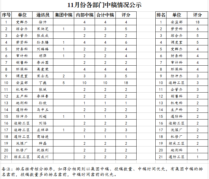 2020年11月份各单位投稿中稿情况公示